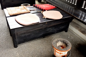 ③木枠を組み立てて砂と海水を入れ鹹水(かんすい)を取り出し