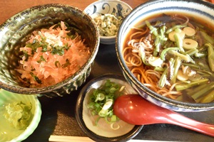 わさび丼(小)、蕎麦(冷or温)、わさび漬けのセット。