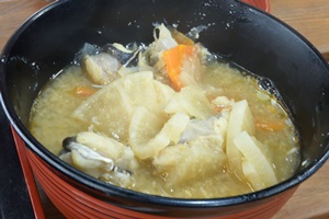 神社のすぐ近くにあるカキ小屋で団体様メニュー