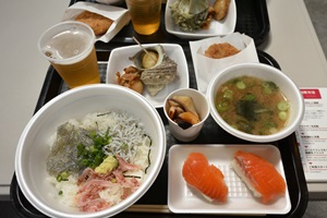 入口でお盆を取って列に並ぶと順番に各種乗っけてくれます。