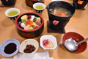 海鮮ばらちらし&蟹と目が合う味噌汁。