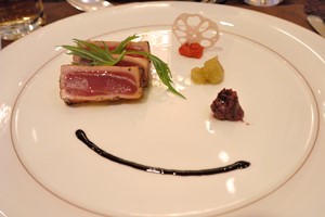 鮪炙り 黒胡椒 セミドライトマト オリーブのペースト