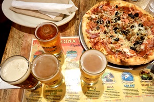 ビール4種飲み比べ(SAMPLER)とピザ。