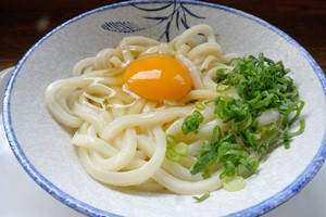 うどんに出汁醤油がかかっていて、生卵をからめて食べます。